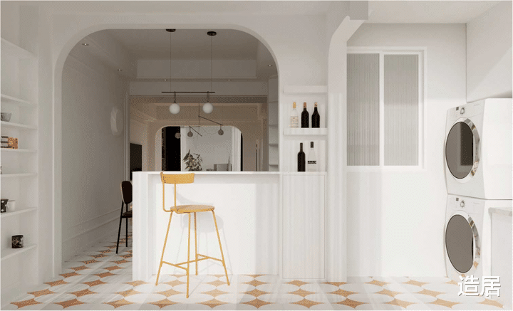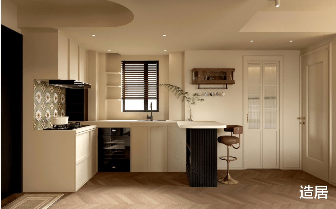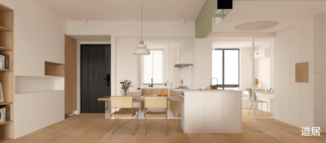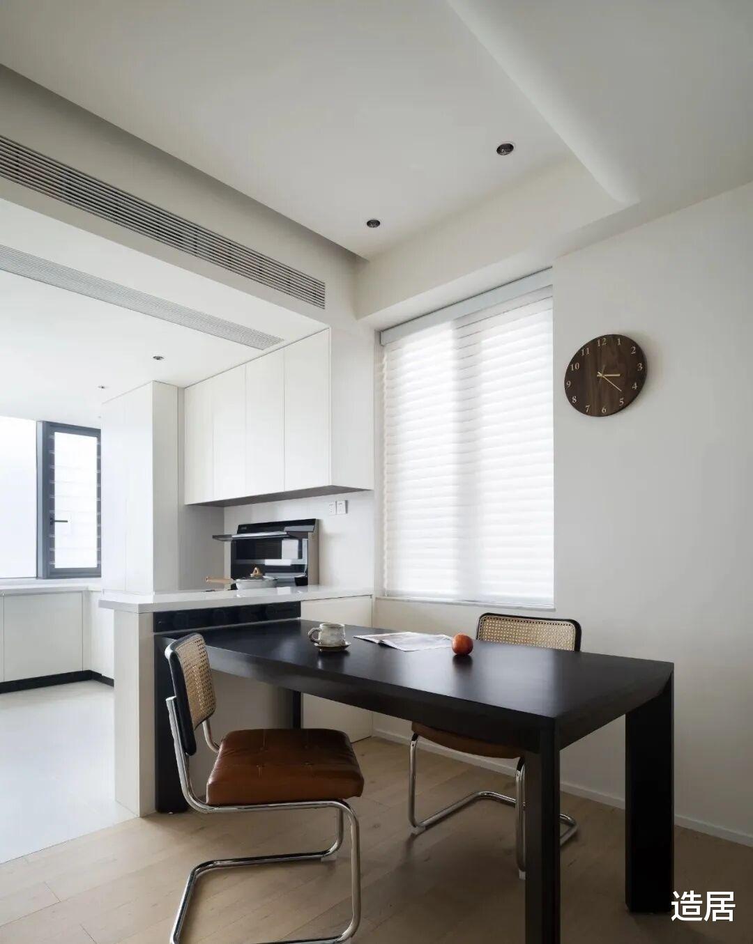 吧台占地极小,一条窄台面就能解决吃饭问题,高度适中,配两把高脚椅,氛围感直接拉满。早上赶时间吃早餐,晚上简单吃晚餐,甚至办公、追剧、孩子写作业都能在吧台完成,一物多用。