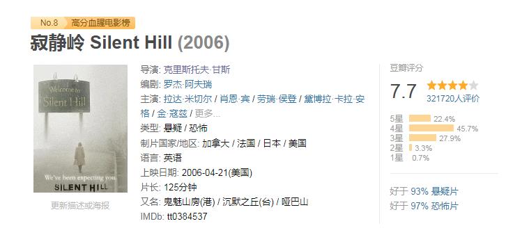 2006年,由同名游戏改编而成的《寂静岭》,上映仅三天就取得了2020万美元票房。