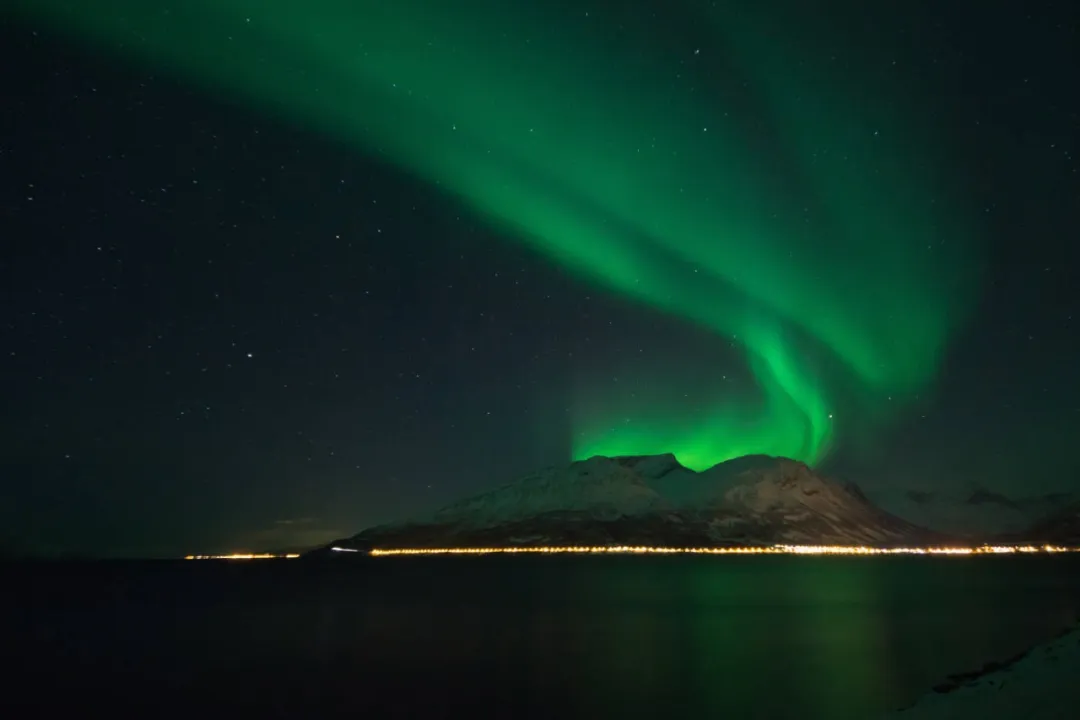 在维京时代,北极光被传说为女武神战士的盔甲;而今,当地人尊敬地称之为“绿色女士”。从每年10月中旬到次年4月初,挪威北部从下午到凌晨都笼罩在黑暗中,随时都会有北极光划过天空,为极光观测提供了绝佳条件。