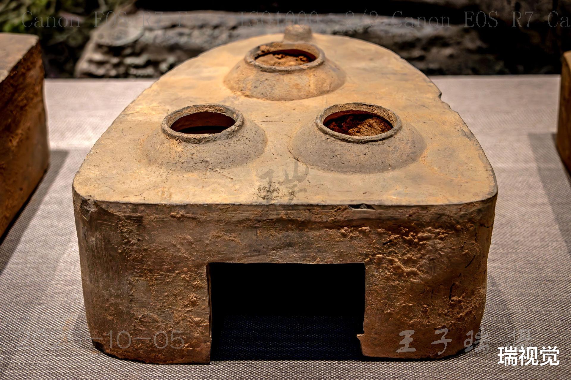 三锅并列的独特设计堪称一绝,这体现了汉代人民的实用智慧。想象一下,在那个没有现代燃气灶的年代,三锅陶灶可同时烹饪多种食物,蒸、煮、烧等多种烹饪方式一灶搞定,大大提高了烹饪效率,完美诠释了汉代先进的厨房理念。