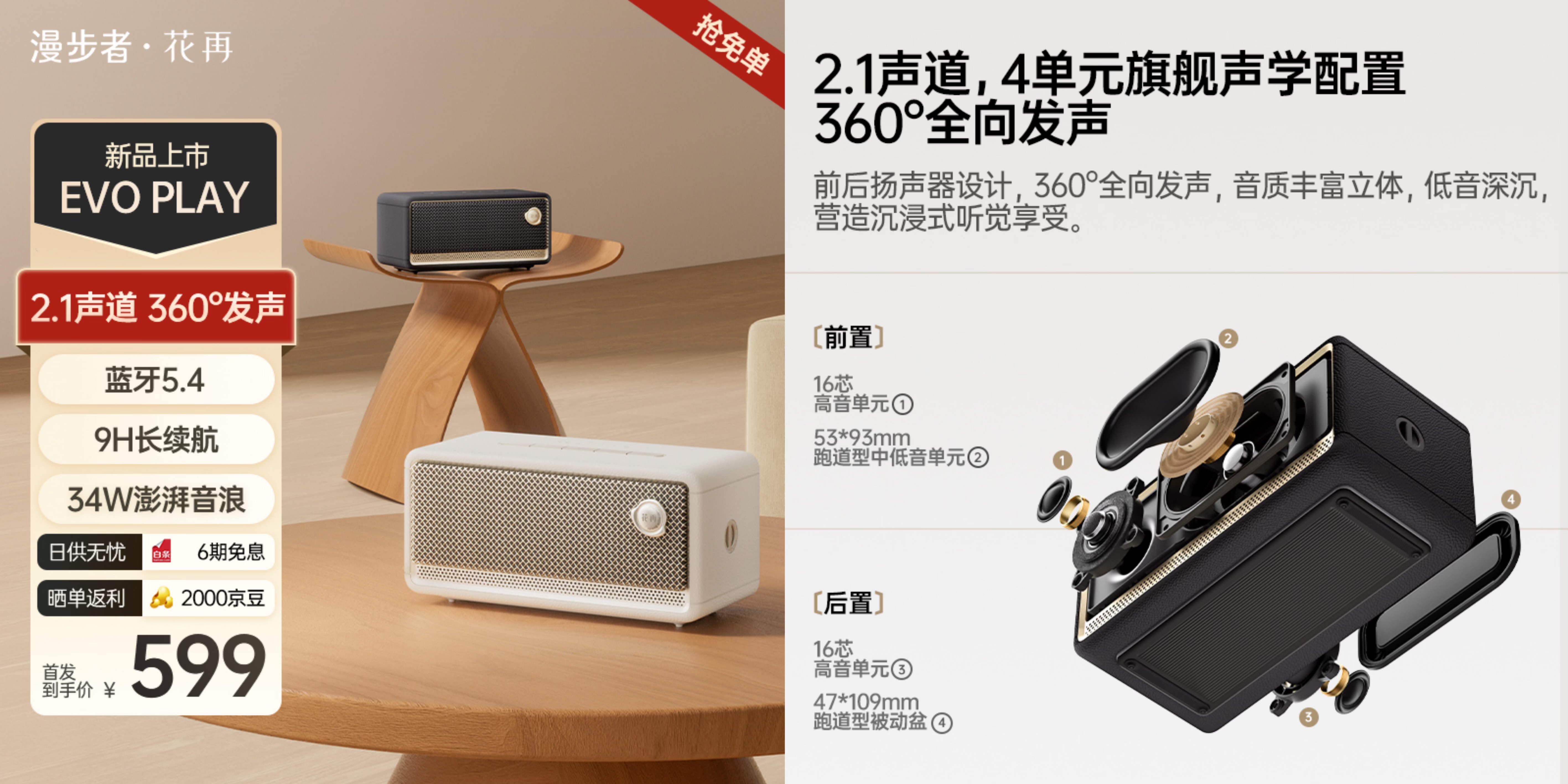 花再,漫步者集团旗下全新年轻音频科技品牌,作为旗舰产品之一的Evo Play依托漫步者28年专业声学实验室的实力调校,以及大师级声学调音APP的辅助,在音质上的表现令人惊艳。独特2.1前后双向扬声器声学系统设计,搭配4单元旗舰声学配置与34W大功率澎湃音浪,360°声场全覆盖让音乐环绕四周,无论是坐在客厅还是漫步于户外,都能感受到音乐的每一个细节,仿佛置身于一场音乐会现场。全DSP数字处理技术的应用更是对声音进行了精细控制,传递出自然真实、层次分明的声音效果。