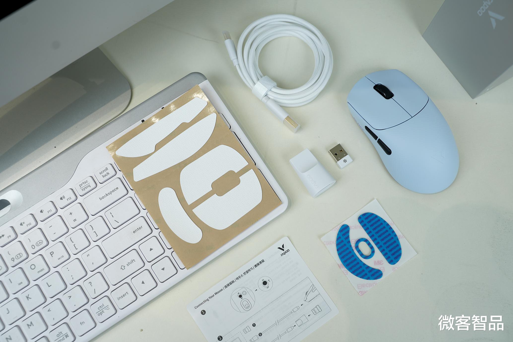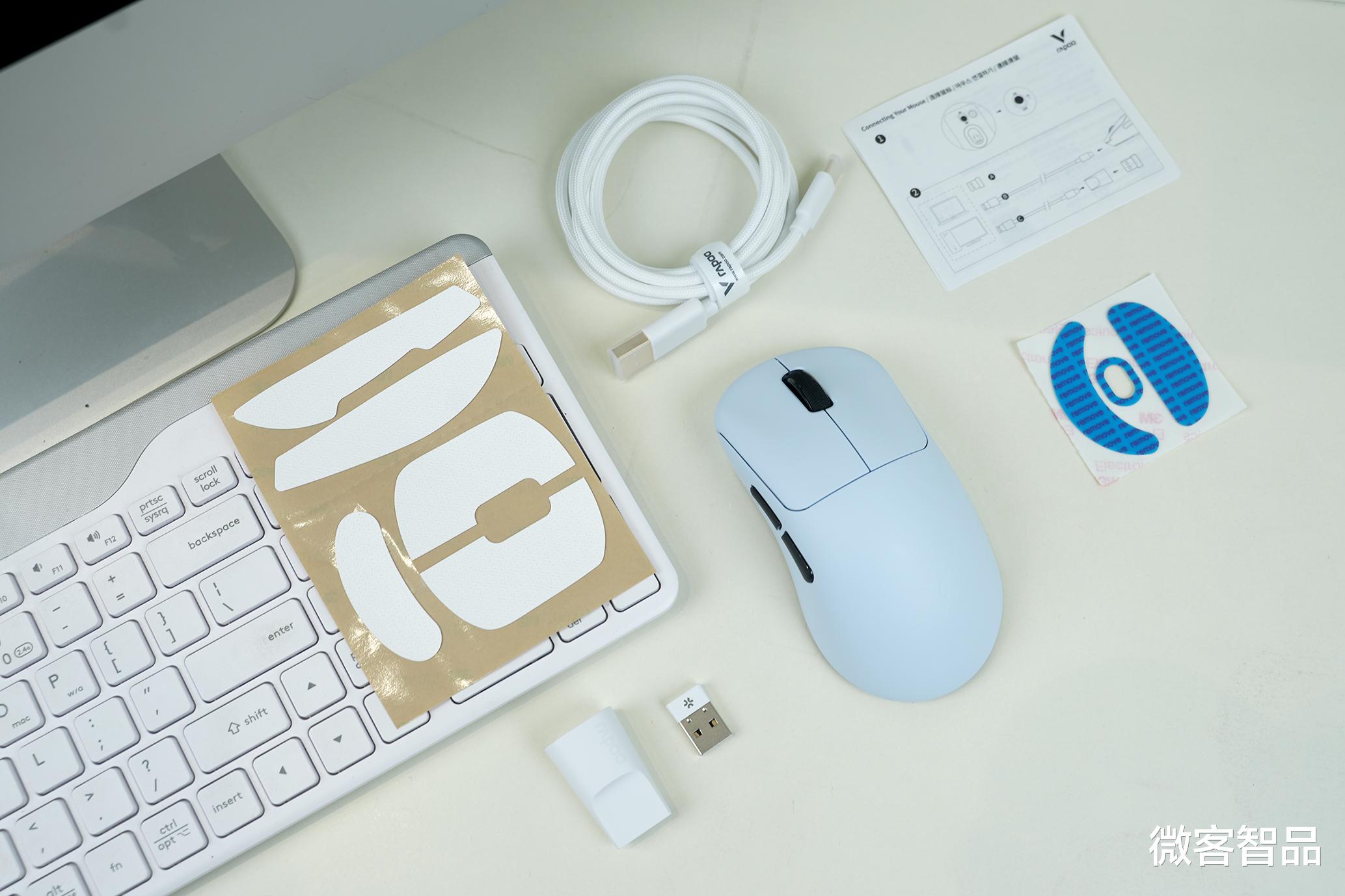 两款鼠标延续雷柏VT系列经典包装风格,简约硬朗的电竞风设计,辨识度拉满。开箱配件堪称诚意满满,除鼠标本体、说明书外,还标配1.8m镀金8K带屏蔽高速数据线、USB转接器、nano 8K接收器,以及专属冰感铁氟龙大脚贴,到手即享完整电竞体验,无需额外添置配件。