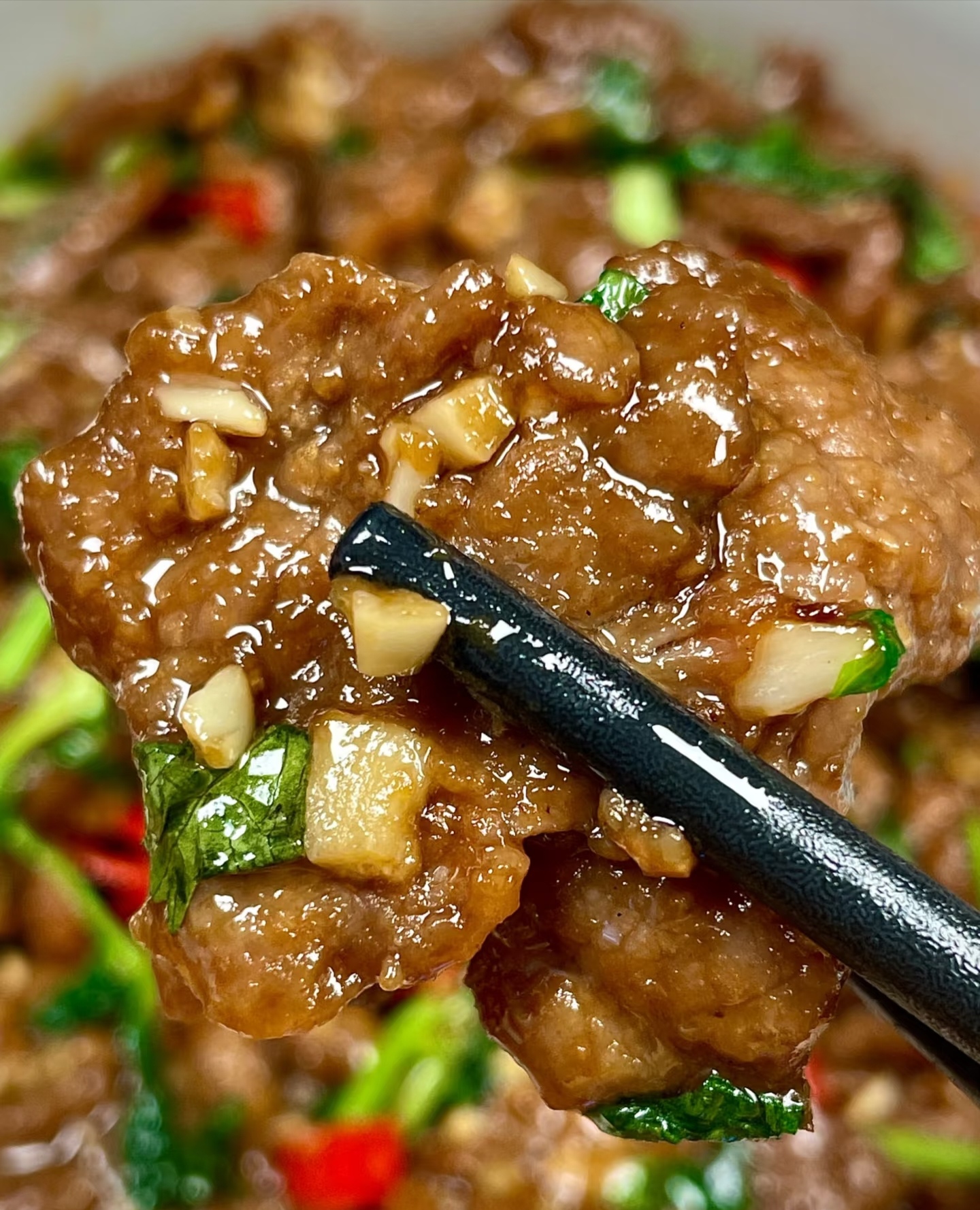 锅烧热,倒2勺油(油多点儿牛肉才不粘锅),油热后转中小火,蒜和辣椒“哗”地一声下锅,香味炸开的瞬间,倒入牛肉。快速翻炒到肉片变色(约30秒),立刻盛出——这是嫩的关键!