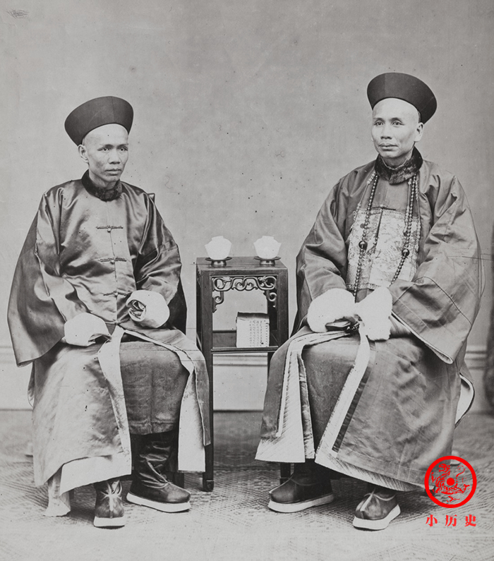 两人均穿官服,不同的是一个加上了补服、挂了朝珠。都戴暖帽,说明照片是在冬天拍摄的。