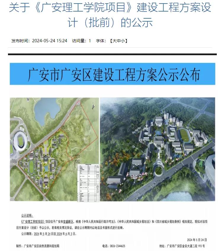 2024年5月,广安市广安区人民政府发布了关于《广安理工学院项目》建设工程方案设计(批前)的公示。