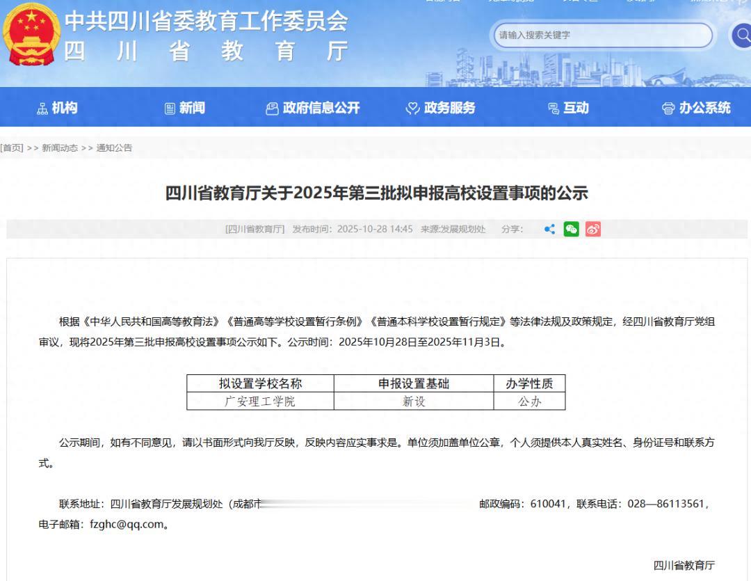 公示显示,拟新设广安理工学院,办学性质为公办。在2025年6月教育部公布的《全国普通高等学校名单》中,广安仅有一所专科院校——广安职业技术学院。广安理工学院的设立,标志着广安将迎来首所本科院校。