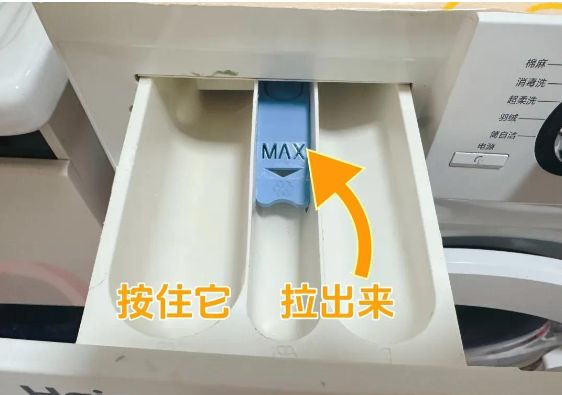 3、滚筒洗衣机,在左上角会有一个“小抽屉”,这是洗涤剂盒。把它拉出来,能看到中间有一个红色或者蓝色的按钮。按住它,把抽屉继续往外拉,就能完全取下来。抽屉的背面,以及洗衣机上的那个抽屉的通道,都是滑溜溜的,这是残留的洗涤剂,也要定期清理。