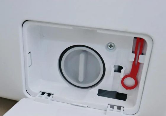 2、滚筒洗衣机,在右下角会有一个长得像汽车油箱盖的东西。打开它,里面是一个可以旋转的手柄。握住手柄,逆时针旋转把它取下来,能看到里面有很多黏糊糊的布料纤维。这是洗衣机的过滤网,也需要定期清理。