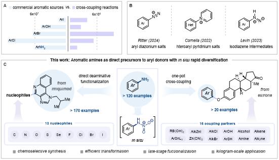 他们开创的“直接脱氨”策略,就像是一场温和而精准的“分子手术”:科学家们无需再借助危险的“重氮盐”作为中介,而是直接在芳香胺这块“基础积木”上操作,像使用“查找与替换”功能一样,将稳定的C-N键,轻松转换为构建药物所需的各种关键连接(C-Br、C-Cl、C-C等)。更重要的是,整个过程平稳可控,没有危险中间体积累。张夏衡笑称,“一个普通药厂的工人,看了我们的配方就能操作。”