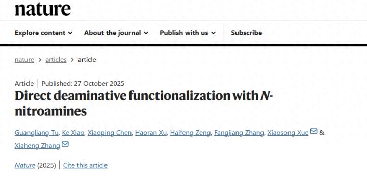就在今天凌晨,国际顶尖学术期刊《Nature》(《自然》杂志)上线了一篇来自中国年轻科学家团队的重磅成果“Direct deaminative functionalization with N-nitroamines(N-硝基胺介导直接脱氨官能团化)”。这不是一次寻常的发表:从投稿到录用仅一个多月,从投稿到见刊仅不到50天,创下罕见高效的Nature投稿纪录;四位审稿人一致给出高度评价,其中辉瑞公司高级研发总监Scott Bagley更评价其为“true tour de force”(真正的杰作)。