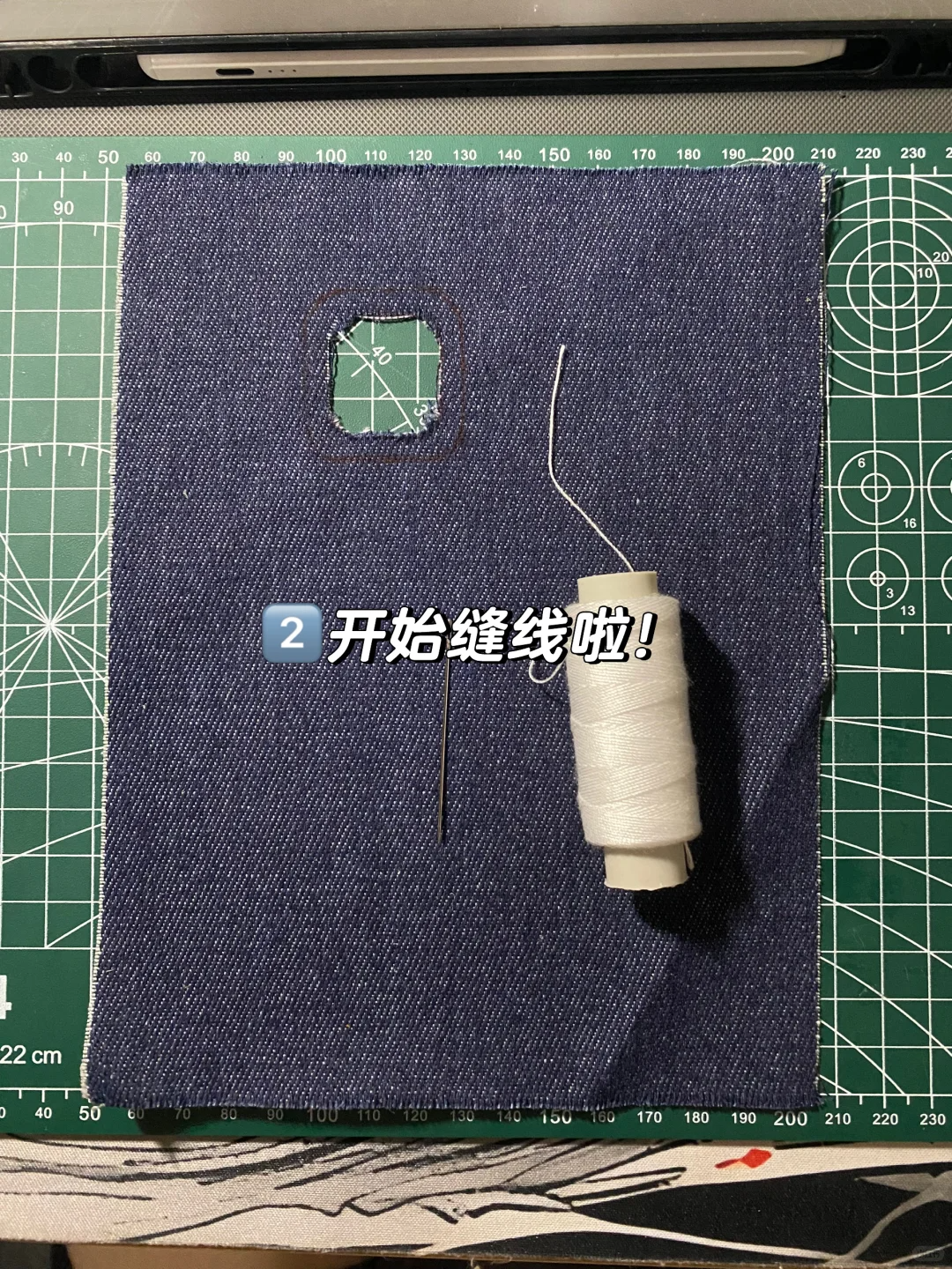 首先找出一块牛仔布和针线,还有胶水以及剪刀。可以用笔标注手将镜头的位置,然后对其进行裁剪。接下来就是对其封边,这部需要耐心。