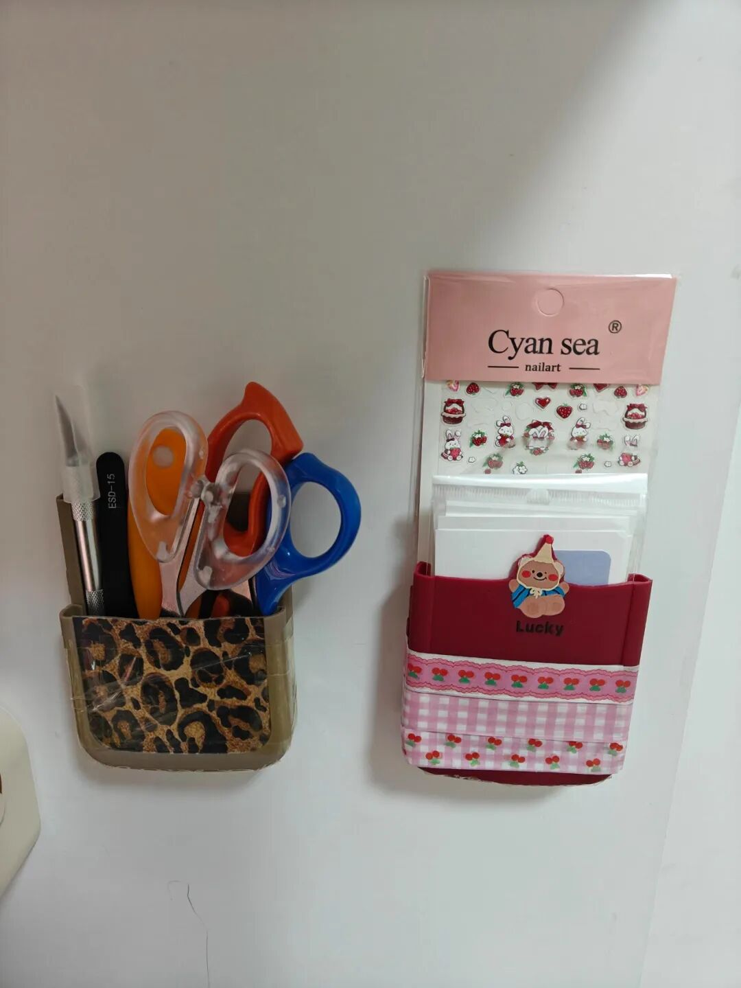 方法特别简单,只需要将手机壳对半剪开,然后用热熔胶粘贴在一起,再贴在墙上就OK~我们就能得到一个墙面收纳盒了。