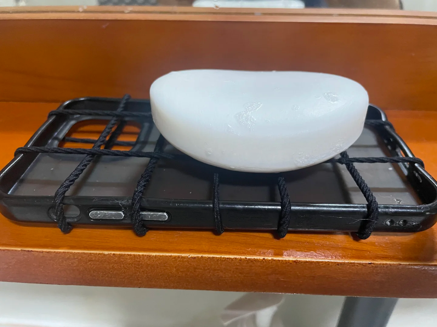 我们把肥皂放上去,不仅方便沥水,还能让闲置手机壳得到利用。