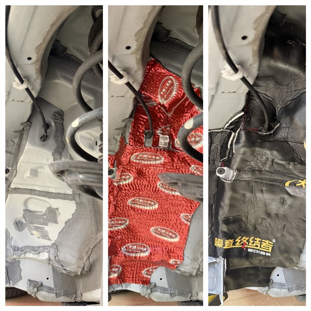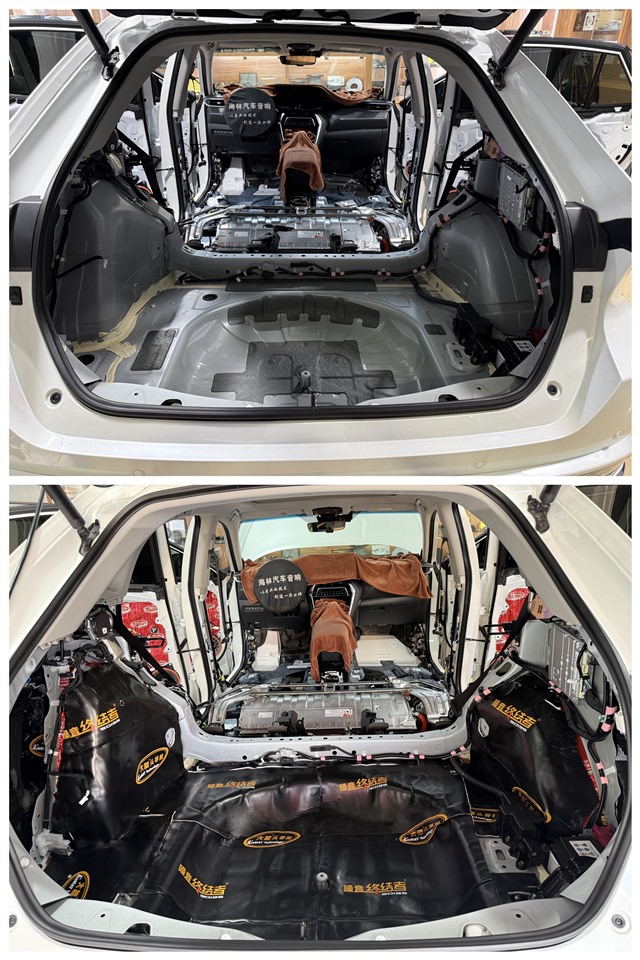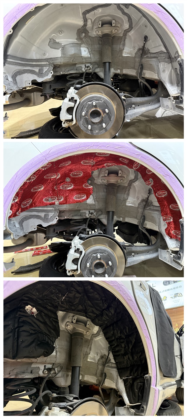 底盘与尾箱是整车噪音传递的核心通道,技师将车体相关部位彻底拆解,露出原生钣金。对比施工前后的状态,原车几乎无有效隔音措施,而升级后,底盘与尾箱均铺设大能红派隔音与超级蕰莎,双层防护有效抑制钣金共振,阻隔路噪与尾排噪音。