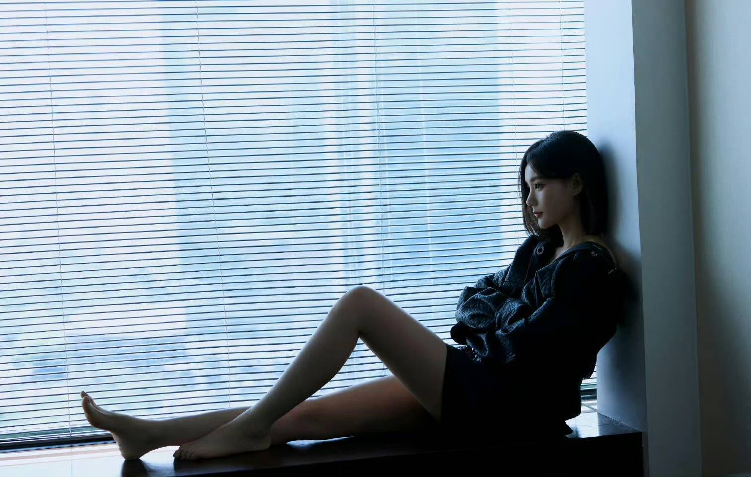 先看她在窗边的造型,阳光透过百叶窗洒进来,她光着脚丫,随意地伸展着,搭配上微微敞开的上衣,露出精致的肩颈线条,整个人散发着一种松弛又迷人的氛围。就好像是在自己家一样,特别自在,没有丝毫拘束感,这种随性的美,特别打动人。
