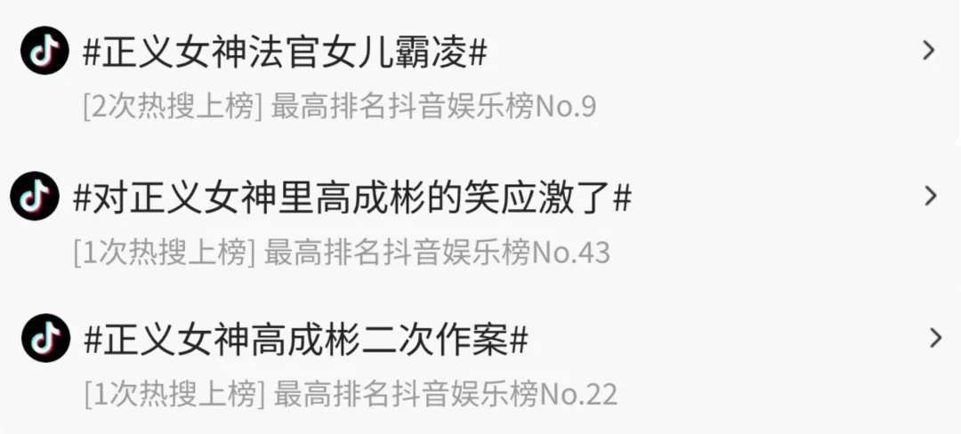 更值得关注的是话题焦点的迁移:热搜从开播时围绕“佘诗曼”“许绍雄遗作”等演员向话题,逐步转向“正义女神法官女儿霸凌”“正义女神高成彬二次作案”以及法理与情理的博弈等剧情向和议题向讨论。