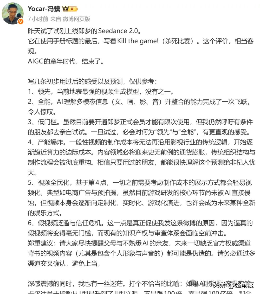 《黑神话悟空》制作人冯骥也发文对Seedance 2.0大加赞赏:“昨天试了试刚上线即梦的Seedance 2.0。它在使用手册标题的最后,写着Kill the game!(杀死比赛)。这个评价,相当客观。AIGC的童年时代,结束了。”