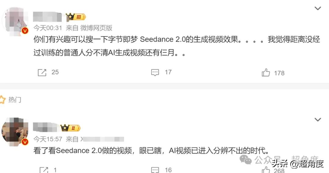 有网友认为,看了Seedance 2.0的生成视频效果后,很快普通人就分不清AI生成视频了。