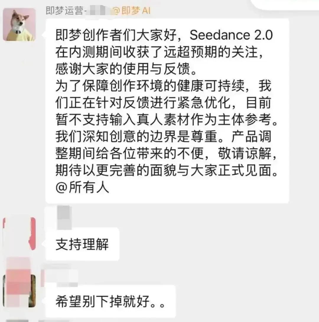 即梦的运营人员表示:“即梦创作者们大家好,Seedance 2.0在内测期间收获了远超预期的关注,感谢大家的使用与反馈。为了保障创作环境的健康可持续,我们正在针对反馈进行紧急优化,目前暂不支持输入真人素材作为主体参考。我们深知创意的边界是尊重。产品调整期间给各位带来的不便,敬请谅解,期待以更完善的面貌与大家正式见面。”