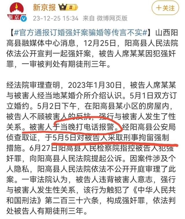 2023年5月,席某某与女方按民间习俗订婚,但未进行婚姻登记。据一审法院认定,席某某在订婚后违背女方意愿强行发生性关系,构成强奸罪,判处有期徒刑三年。席某某不服判决提起上诉,案件于2025年3月25日二审开庭,法院择期宣判。