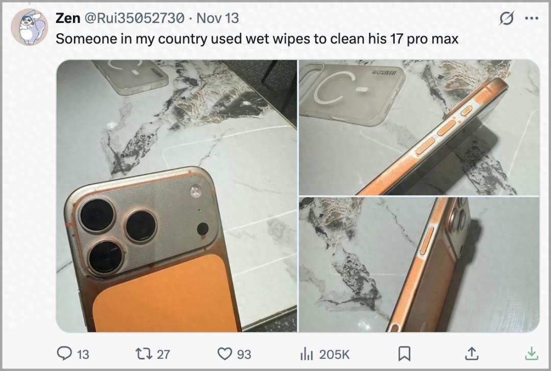 星宇橙作为 iPhone 17 Pro 系列新推出的配色,此前已引发广泛关注的褪色问题最早也是出现在这一配色上。现在使用清洁用品中含有过氧化物或酒精等化学物质,竟然会使机身漆面严重脱落!