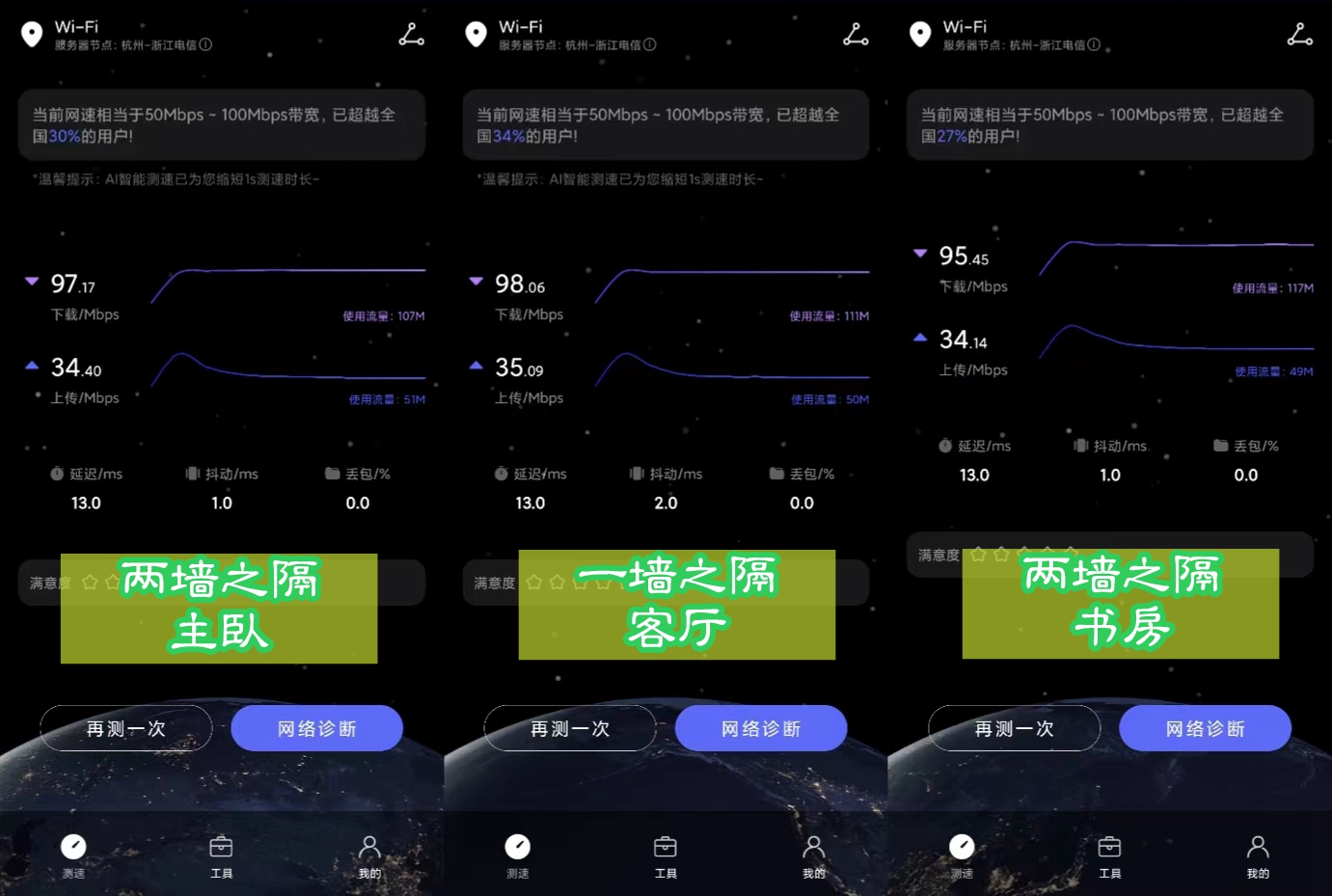 我家目前在用的好像是中国移动百兆网线,这次把路由器安置在次卧,相隔两道墙,然后在客厅、阳台和关门密闭的卫生间,信号相差可以忽略不计,可见天蝎的穿墙能力强悍以及令人惊叹的稳定,几乎都是百兆左右,看来是移动这次没有骗我。