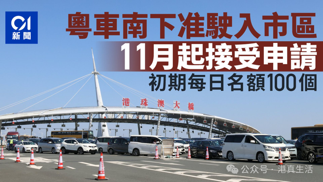 根据官方消息,这项计划将于11月起试行,首阶段每天开放100个粤牌私家车的入境配额,车辆可通过港珠澳大桥驶入香港,并可在港停留最多3天。