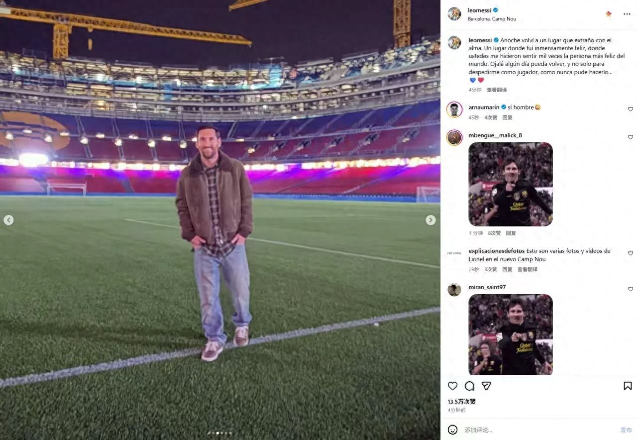 结束美职联季后赛首轮比赛后,梅西乘机来到了西班牙与阿根廷国家队在阿利坎特,不过在这个过程中,梅西晚上和德保罗一起探访了昔日自己成名和奋斗过的地方诺坎普,并在这里打卡拍照,甚至留下了一段让人浮想联翩的文字。