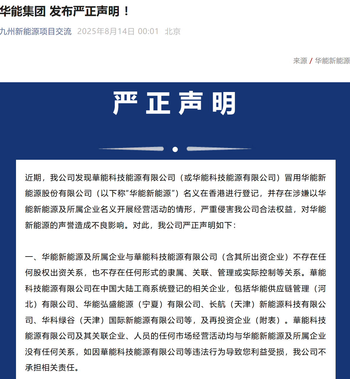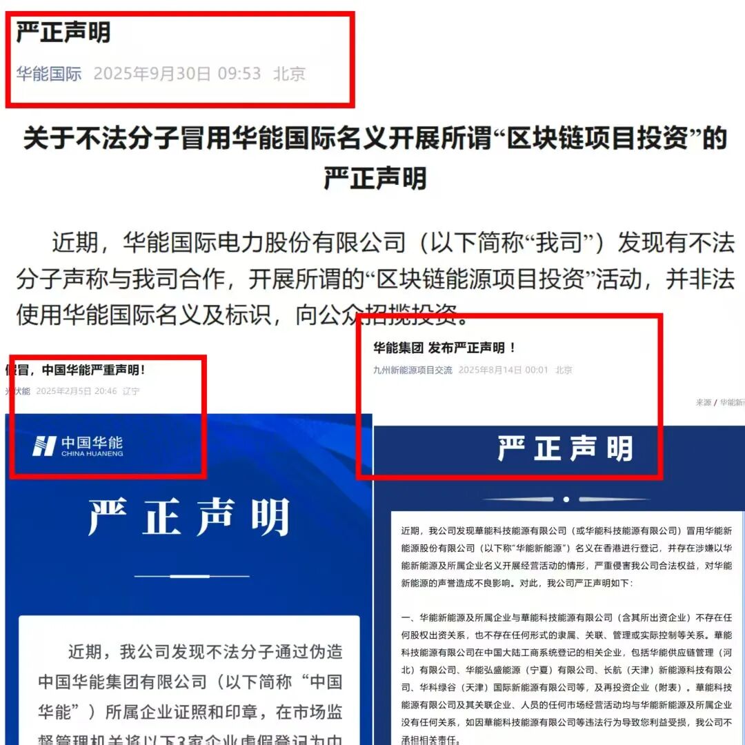 “中国华能集团”也不止一次提醒广大投资者注意辨别市场经营主体身份,提高风险防范意识,切勿相信或参与華能科技能源有限公司及其关联企业冒用华能新能源及所属企业名义宣传、开展的任何投资、交易及其他活动,以免上当受骗。