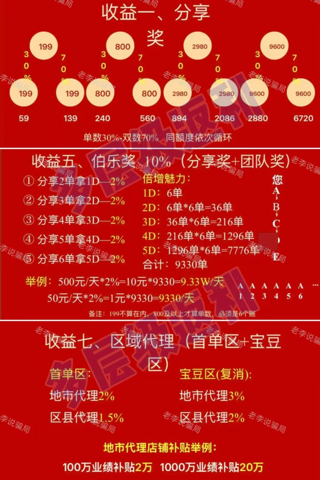 同时,其推广模式设置分享奖、平级奖、团队奖、伯乐奖等七项收益机制,并设置199-9600预案等不同价位参与门槛,按照推荐人数和层级获取比例提成,符合传销核心特征。