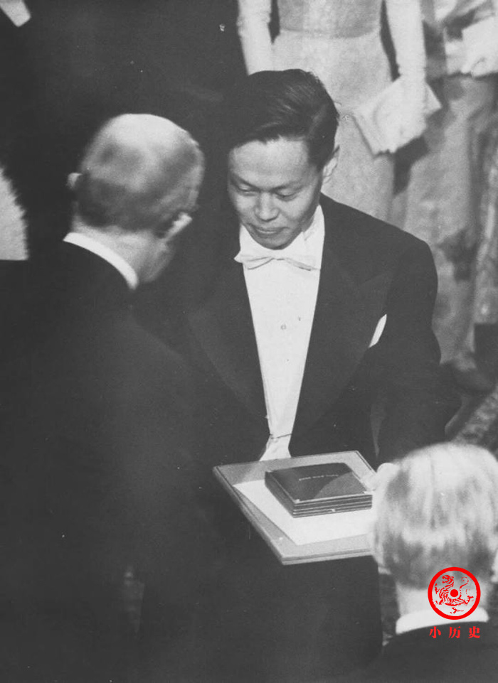 1957年杨振宁接受诺贝尔奖章。