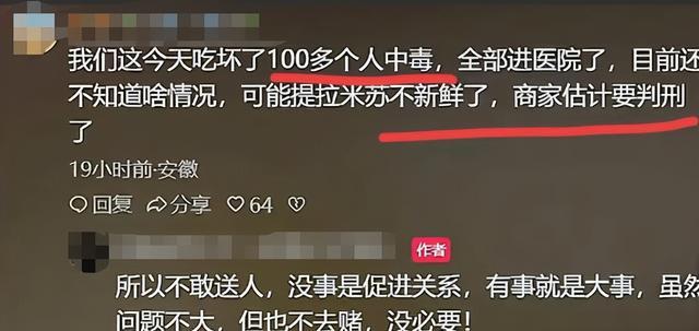如今,关于提拉米苏这件事已引发众人关注,希望相关部门严查后能给众人一个公道。毕竟这种大规模中毒的示例,跟投毒并无两异,如果事实属实,可能面临判刑的风险。