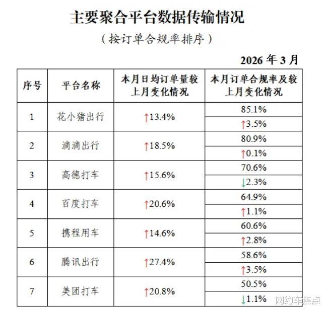 网约车监管信息交互系统数据显示,2026年3月份全国共收到订单信息9.64亿单,较2月份的7.65亿单环比增长约26%,市场回暖迹象明显。