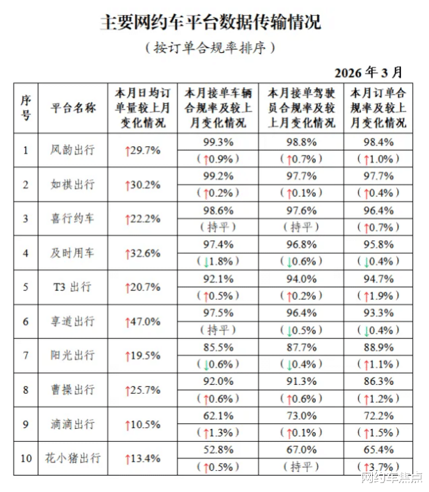 2026年4月22日,交通运输部网约车监管信息交互系统发布了3月份的行业运行数据。