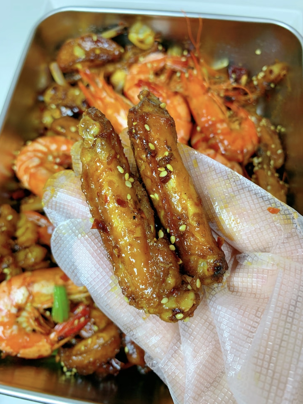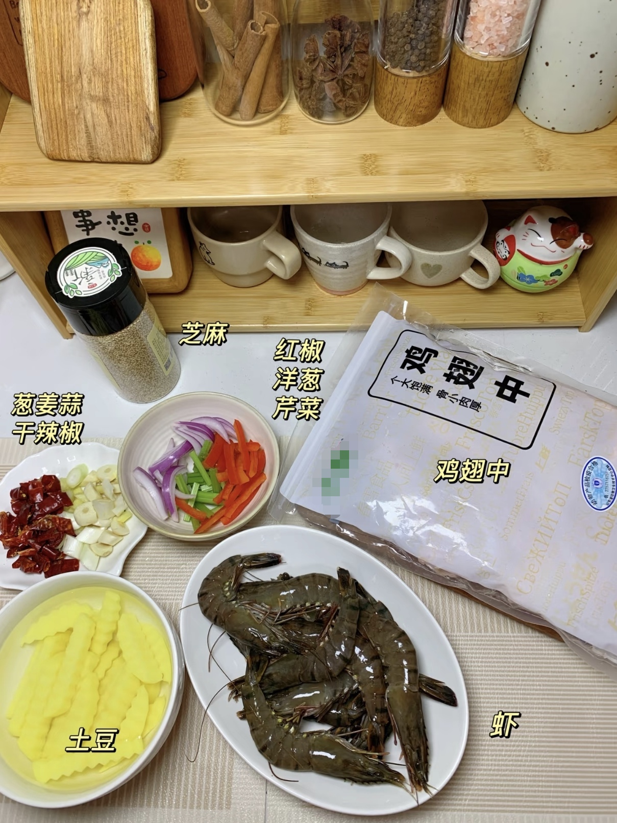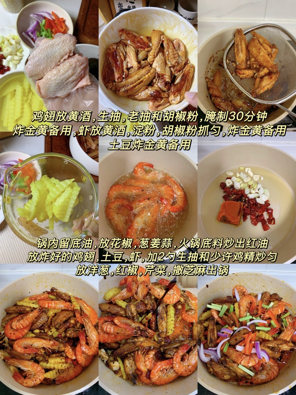-“巨巨巨好吃”的家庭简易版干锅鸡翅虾别被饭店里那红彤彤的一锅吓到,在家做,咱们讲究的是“家常”和“简单”,精髓在于味道的复刻和技巧的简化。食材:鸡翅中,大虾,土豆,葱姜蒜,花椒,洋葱,芹菜,干辣椒,红椒,火锅底料做法:1. 鸡翅中放黄酒,生抽,老抽,和胡椒粉腌制30分钟,炸金黄备用2. 虾放黄酒,淀粉,胡椒粉抓匀,炸至金黄备用3. 土豆炸金黄备用4. 锅中留底油,放花椒,葱姜蒜,干辣椒,一小块火锅底料炒出红油,放入炸好的土豆,鸡翅,和虾,放两勺生抽和少许鸡精翻炒均匀,放红椒,洋葱,芹菜,最后撒白芝麻即可!