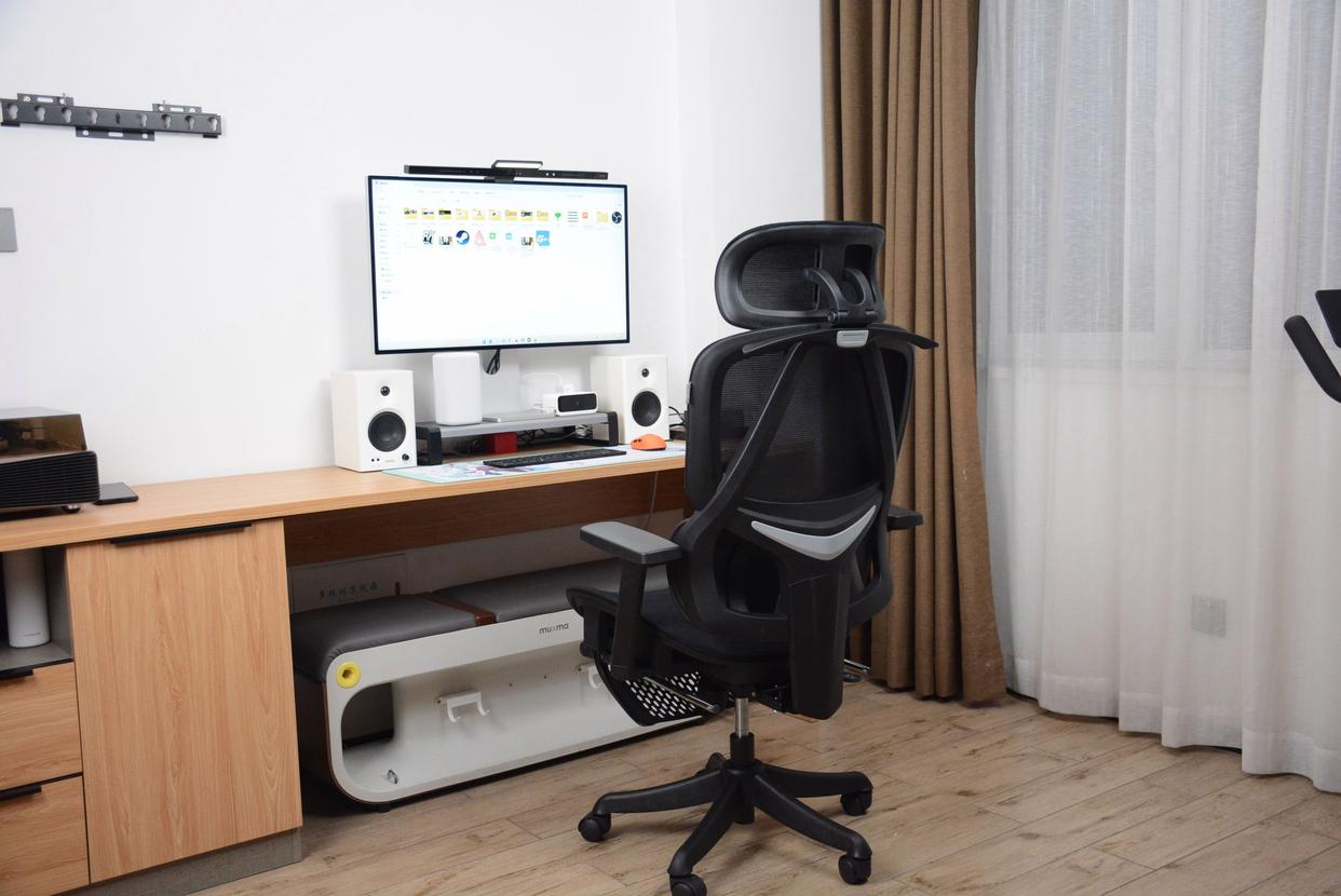 调节表现:调节功能全面,适配办公与休息场景。扶手调节可与椅背后仰联动,贴合身体姿态变化;靠背后仰最大角度约150度,搭配隐藏式伸缩脚踏,方便短暂小憩。头枕支持多角度旋转,能适配不同颈部姿态。缺点是仅两档锁定,角度跨度略大,难以找到更精准的休息角度。