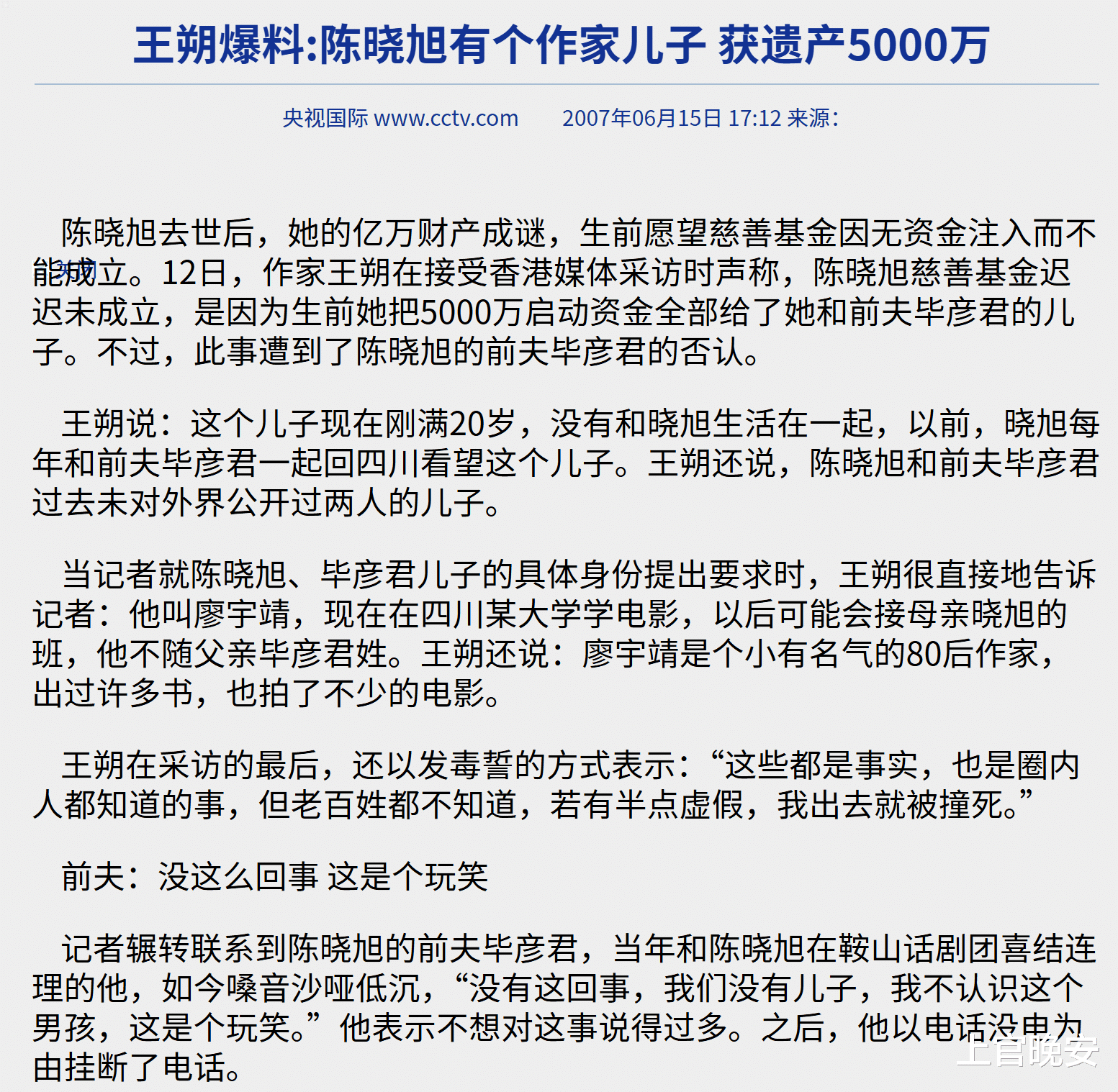 2007年5月13日,陈晓旭离开人世。随后不久就有媒体扒出陈晓旭和毕彦君的婚史,还有人假借作家王朔的名头爆料陈晓旭和毕彦君有个儿子,陈晓旭把5000万遗产留给了儿子,爆料的内容非常地详细,儿子的姓名、照片、职业都清清楚楚。