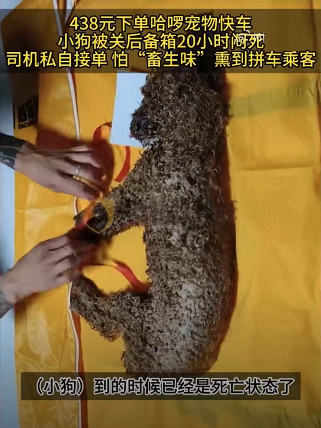 吴女士说,在下单前被哈啰宠物快车的“宠物独行,司机友好”宣传语打动,本想着花钱消费让爱宠舒适的目的,结果酿成了一场悲剧。原本5小时的路程,司机却整整耗费20小时!司机无暇顾及小狗,只是一味多接订单,并且因为异味怕影响生意,而将其关进后备箱。