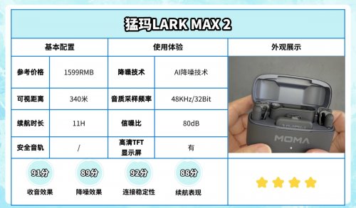 猛玛LARK MAX 2发射器重14.1g,亲肤磨砂机身搭配悬停金属领夹,支持反戴隐藏,夹衬衫领口或西装内衬都稳固,久戴无坠感。相机接收器带触摸显示屏与旋钮,调增益、降噪档位直观,冷靴接口直连相机很方便。但机身材质偏软不耐磨,长期使用易出现摩擦痕迹;充电盒体积偏大,搭配帆布收纳包虽便携,却比普通麦克风盒更占背包空间,单人轻装出行略有负担。