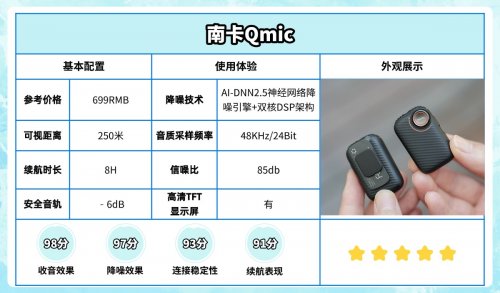 性能配置上,南卡QMic采用48kHz采样率+24Bit位深的旗舰级录音规格,还搭载AI-DNN2.5神经网络降噪,以及严格遵循专业级声学标准,结合三重防爆音系统与双核DSP并行架构,实现人声还原度高达98%以上。再加上20档增益调节与双档可调降噪,6dB安全音轨实时备份、实时监听耳返等多种功能,其内置的鲸语Comm通信技术,实现最远250米稳定收音,使得收音细节与稳定性达到行业巅峰,被誉为“领夹麦行业的真旗舰”,属于盲选不会错的产品!