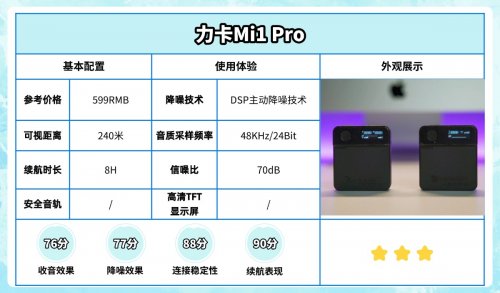 力卡Mi1 Pro发射器重33.2g,方块磨砂机身搭配弹力背夹,夹持稳固但久戴有明显坠感,轻薄衬衫易被拉扯变形。搭载全指向电容咪头,支持48kHz/16Bit采样率,室内口播人声还原清晰,还能切换单/立体声模式,后期创作更灵活。