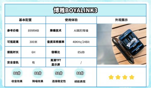 博雅BOYALINK3发射器仅9g,磁吸背夹设计夹衣领或贴内衬几乎隐形,久戴无坠感,透明充电盒还能直观查看电量。支持48kHz/24Bit采样率,室内口播人声清晰,6档增益调节可精准控音,搭配AI降噪3.0技术,能滤除键盘、空调等稳态杂音。但短板突出:全指向咪头在街头等嘈杂环境下,人声易被背景音削弱,需凑近才能保证清晰度;强降噪档虽能压制突发噪音,却会让低频人声变闷,需后期微调。背夹偏大,剧烈运动时偶尔晃动,夹厚衣物还需用力掰动。