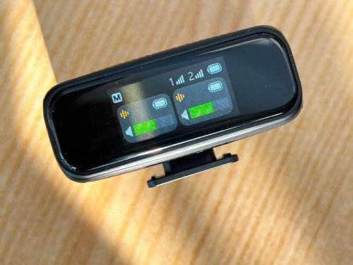 罗德Wireless ME发射器单只重32克,采用传统背夹设计,夹持力扎实,夹在厚外套或西装领上跑动拍摄也不会松动。但重量偏沉,长时间夹在薄衬衫领口,颈部会有明显压迫感,还容易把衣物压出褶皱,影响画面观感。接收器带2.5D玻璃面板,质感不错,且内置麦克风,两台设备就能实现双人采访收音,省去额外配件的麻烦。不过背夹边缘略锋利,取用时偶尔会勾到针织面料。