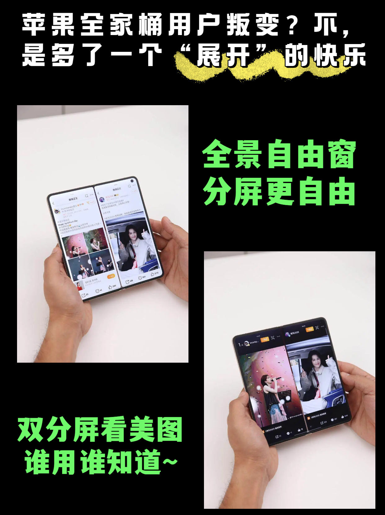 以前出门带两台手机,现在一台N6全搞定——看视频展开大屏,回消息折起来用小屏,切换行云流水。最近追《乘风2026》,我小时候就超迷曾沛慈,听说她要上节目,特意去扒站姐实拍。Find N6这个大屏分屏,一边看照片一边刷视频,比iPhone爽了不是一星半点😄