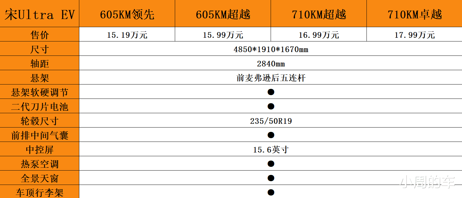 其中,作为入门款的605KM领先型,它与高配车型一样,采用了前麦弗逊后五连杆式独立悬架,轮圈尺寸也同为235/50R19,与此同时,像第二代刀片电池(支持闪充)、前排中间气囊、悬架软硬调节、车顶行李架、全景天窗、15.6英寸中控屏、热泵空调等配置也都保持了一致,换句话说基本的硬件配备没有高低配之分。