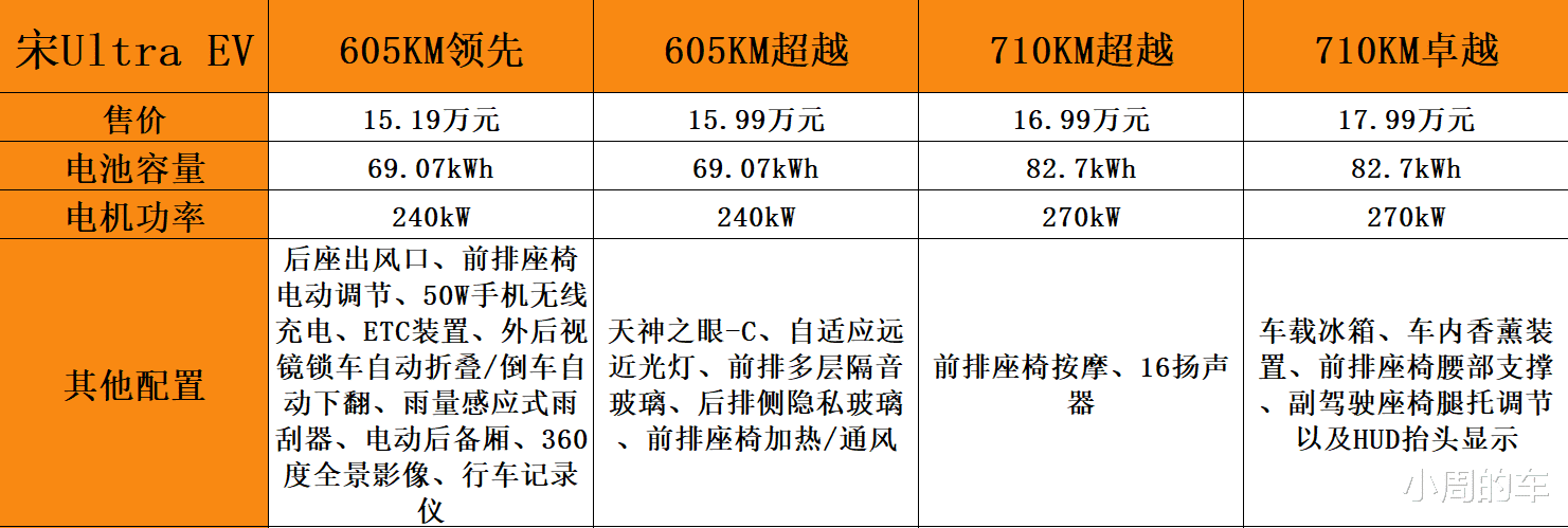 看到这儿先别着急入手,因为710KM超越型在605KM超越型的基础上又贵出了1万元,除了将电机最大功率提升到了270kW外(605KM版本电机功率240kW),电池组容量也由69.07kWh提升到了82.7kWh,纯电续航里程提升超过100km,配置端还增加了前排座椅按摩以及16扬声器(605KM版本扬声器数量为8个),该版本未来有望成为全系的走量车款。
