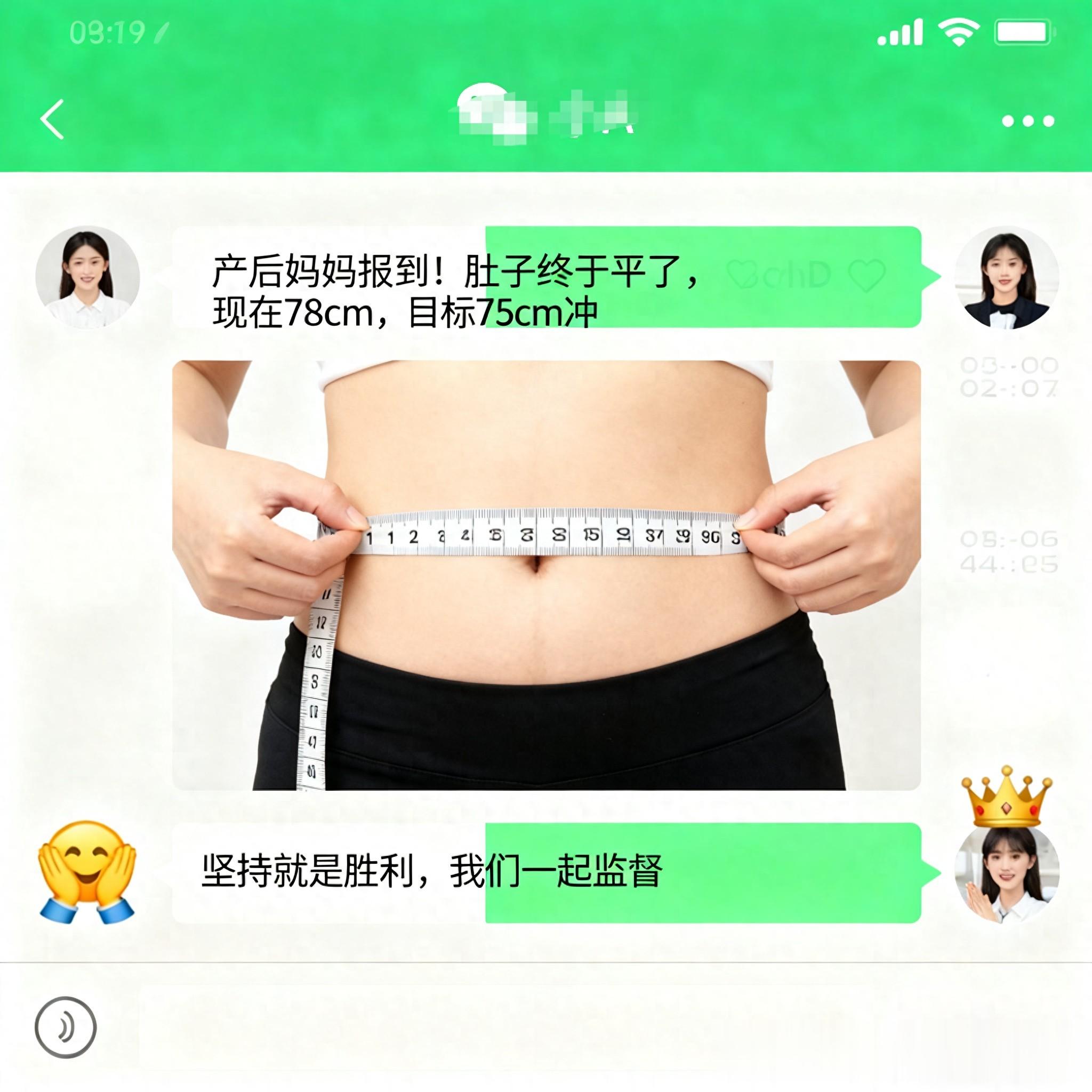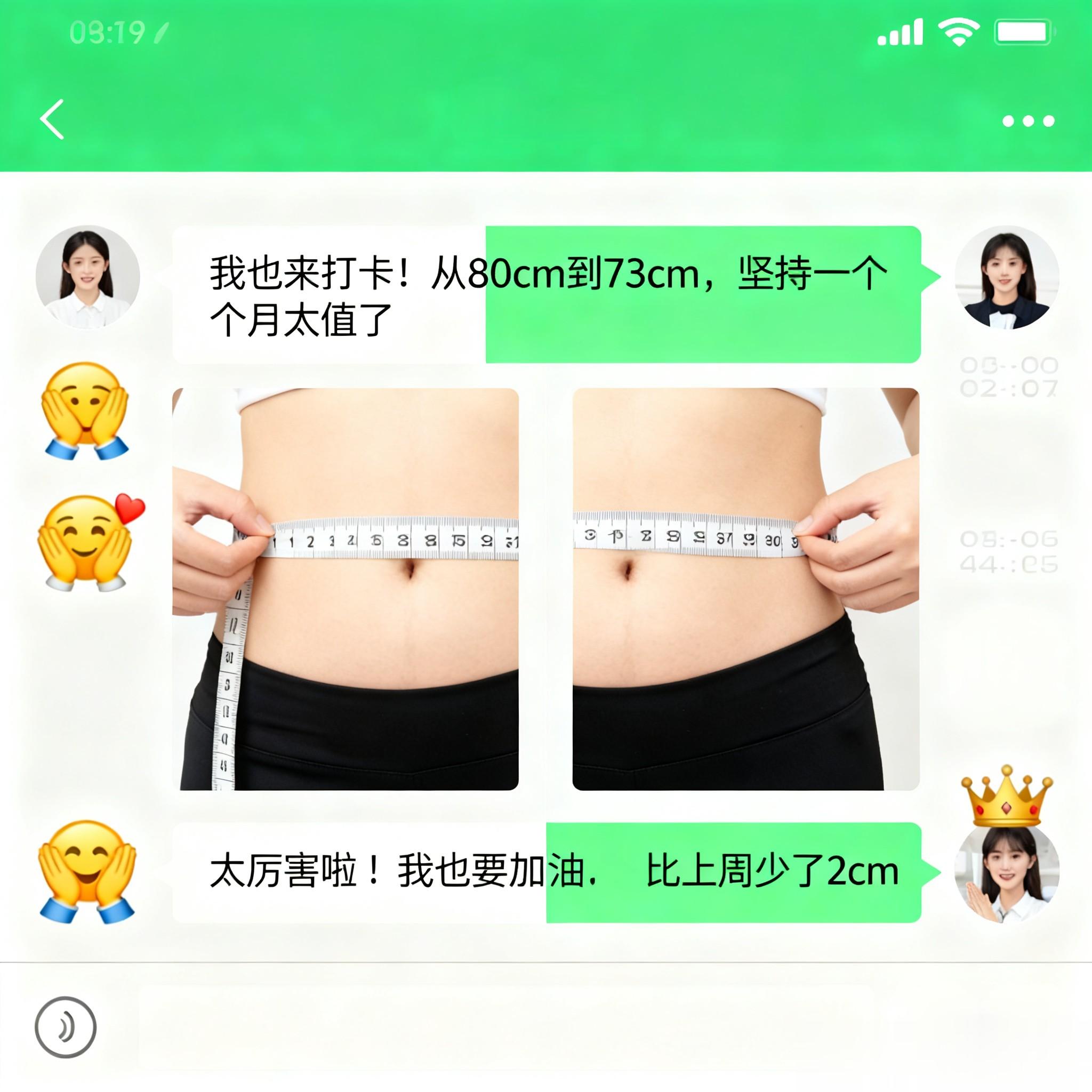 7天后,我拿着软尺量腰围,差点以为量错了——居然从78cm降到了75cm!虽然只是3cm的变化,但穿裤子时明显感觉腰腹不再紧绷,坐下时也不会有肉挤出来的尴尬。更让我意外的是打卡群里的氛围,每天都有姐妹晒出自己的进展:有人产后肚从85cm瘦到72cm,有人久坐形成的“救生圈”两周就小了一圈,还有人分享“之前穿不上的牛仔裤,现在能轻松塞下一只手”。