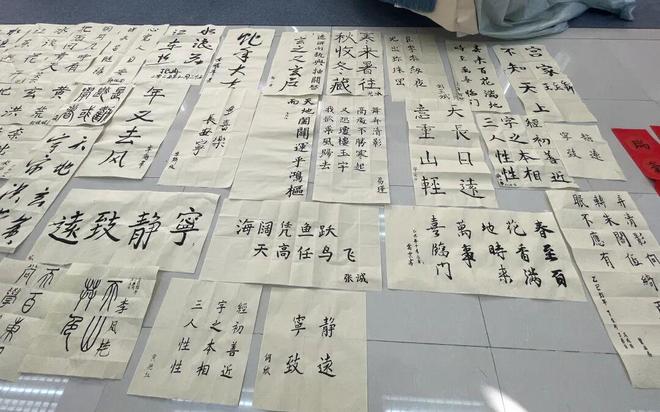 小学部教职工聚焦经典诗词与启蒙名言,书写“吉祥词、”“春风化雨,润物无声”等内容,传递教育温情;初中部教职工围绕师德师风与励志箴言,挥毫“学为人师,行为世范”“天行健,君子以自强不息”,彰显师者担当;高中部教职工则摘抄教育论述与家国情怀篇目,“师者,所以传道授业解惑也”“为党育人,为国育才”等笔墨苍劲有力,尽显教育格局。
