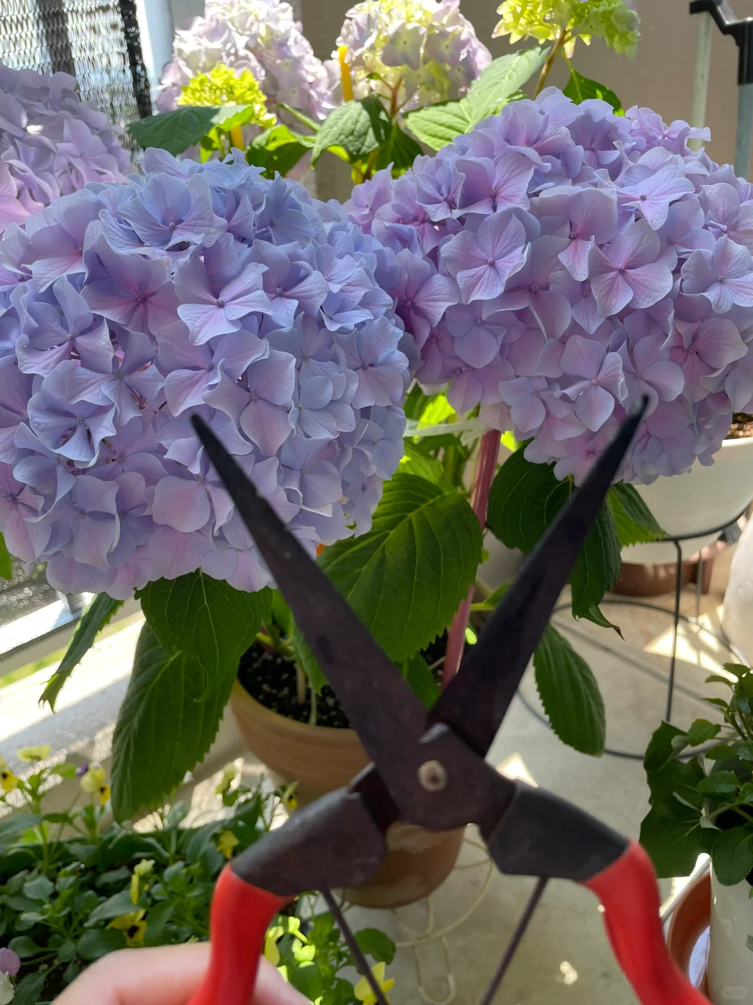 盆栽的话趁早挪到室内,如果室内的环境温度可以稳定在10度以上,那么就可以只剪掉部分徒长过密的枝干,见干见湿的浇水,隔半个月用一次磷酸二氢钾喷洒叶片,这样说不定绣球花可以继续开花。