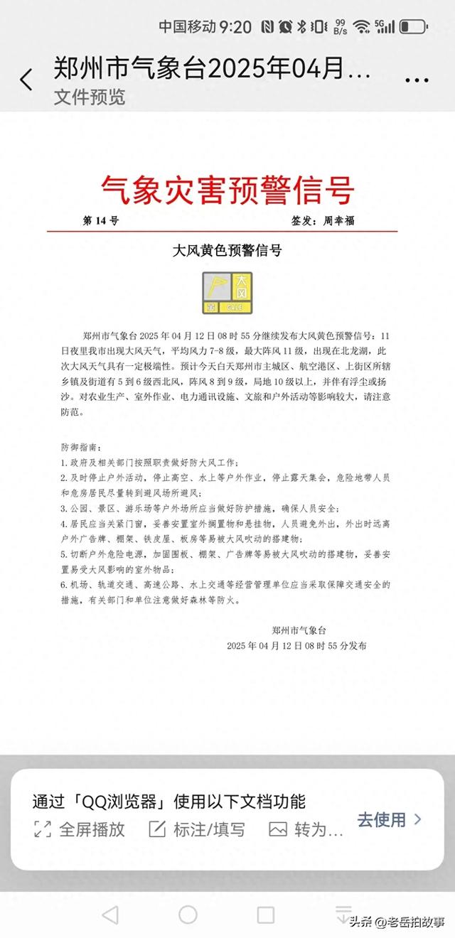 2025年4月12日,郑州市出现异常天气,大风来袭。各单位都发出了大风黄色天气预警。